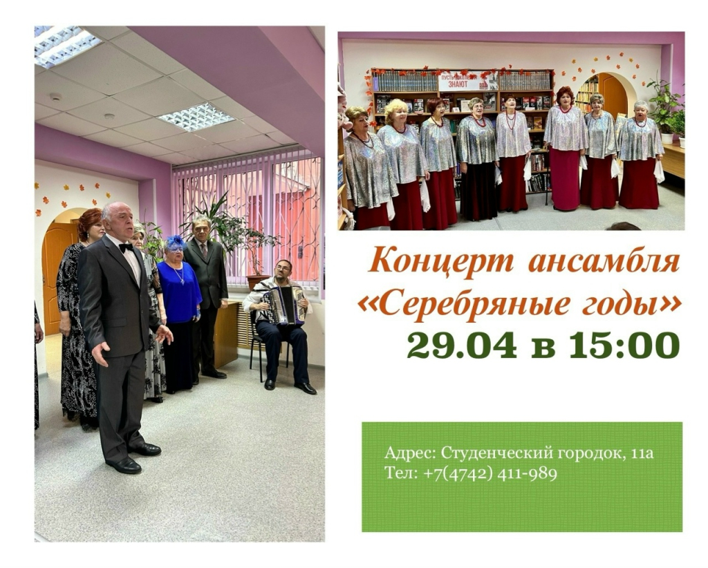 Зрителей ждёт встреча с ансамблем «Серебряные годы» под руководством талантливого музыканта Андрея Насонова. В исполнении коллектива прозвучат мелодии, наполненные светом, нежностью и любовью к родной природе, песни о весне, первой любви. Встреча в преддверии великого праздника – Дня Победы никого не оставит равнодушным.